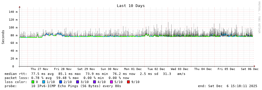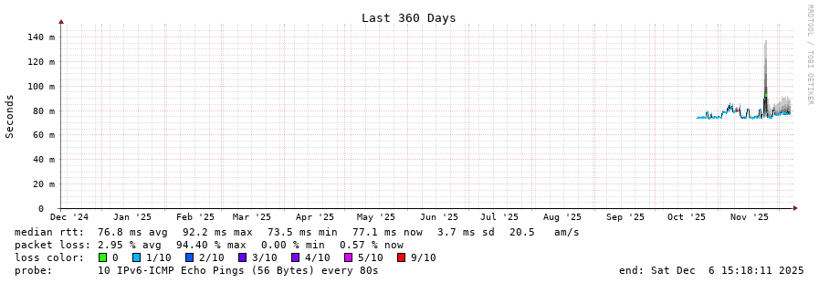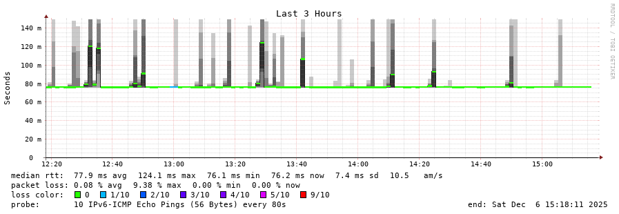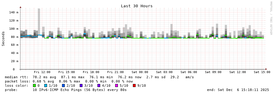 traceroute to 2a0c:9a40:8610:e3f::1 (2a0c:9a40:8610:e3f::1), 30 hops max, 80 byte packets - Generated at 2025-12-06 15:15:01